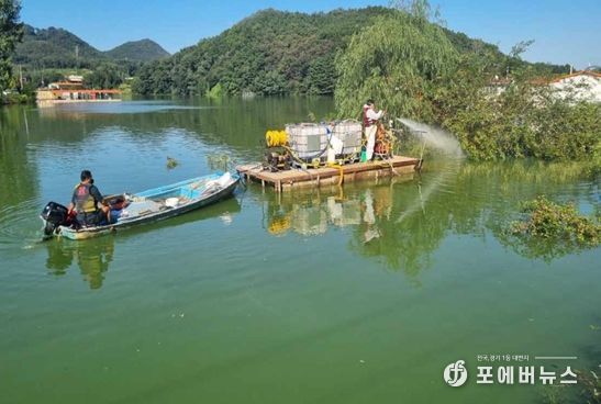 이날 녹조방제 작업은 환경부 인증 친환경 녹조제거제를 저수지 수면에 살포하는 방식으로 진행했다.