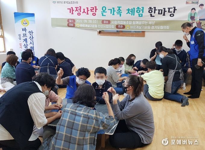 [ 포에버뉴스 김경순 기자 ] 바르게살기운동안산시협의회는 지난 28일 사회적협동조합 ‘함께 꿈꾸는 세상’을 방문해 ‘가정사랑 온가족 체험 한마당’ 행사를 진행했다고 29일 밝혔다.