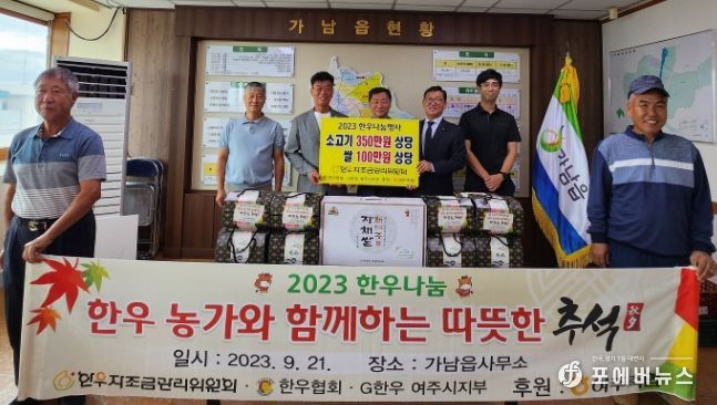 [ 포에버뉴스 김경순 기자 ] 추석 명절을 맞아 전국한우협회 여주시지부는 지난 21일 가남읍 행정복지센터에 방문하여 취약계층을 위한 백미 100만원, 소고기 350만원 상당의 후원물품을 전달했다.