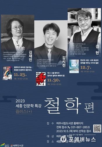 [ 포에버뉴스 김경순 기자 ] 여주시는 오는 11월 넷째 주 목요일부터 12월 첫째 주 목요일까지 세종도서관 여민홀(1층)에서 '세종 인문학 특강 플러스(+)' ‘철학 편’을 운영한다.