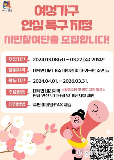 [ 포에버뉴스 최진성 기자 ] 안성시는 대덕면 내리를 여성가구 안심특구로 지정하고 안전시책을 지속적으로 추진하여 모두가 행복하고 안전한 도시 구현에 기여하고자 수시로 현장 모니터링과 의견수렴을 할 수 있는 “여성가구안심특구지정 시민참여단”을 공개모집 한다.