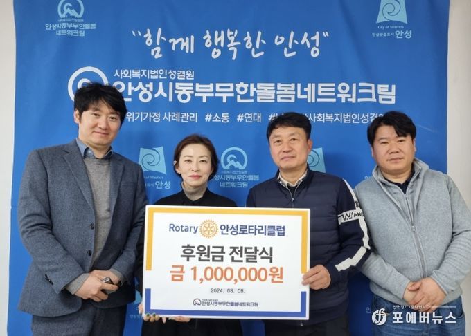 [ 포에버뉴스 최진성 기자 ] 안성시동부무한돌봄네트워크팀은 지난 29일 국제로타리3600지구 안성로타리클럽으로부터 도움이 필요한 이웃들에게 사용해 달라며 후원금 일백만원을 전달받았다.
