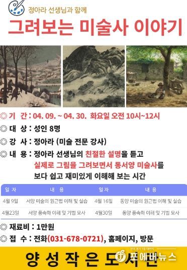 [ 포에버뉴스 최진성 기자 ] 안성시 양성작은도서관은 3월 13일부터 체험형 인문학 프로그램 ‘그려보는 미술사 이야기’의 참가자를 모집한다.