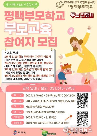 [ 포에버뉴스 최진성 기자 ] 평택시가족센터가 오는 3월 25일까지 [평택부모학교] 부모교육에 참여할 참여자를 모집한다.