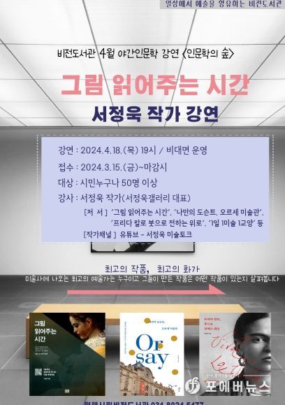 [ 포에버뉴스 최진성 기자 ] 평택시립 비전도서관이 오는 4월 18일 저녁 7시 아트 디렉터이자 작가로도 활동하고 있는 서정욱 님과 '그림 읽어주는 시간' 강연을 비대면으로 진행한다.