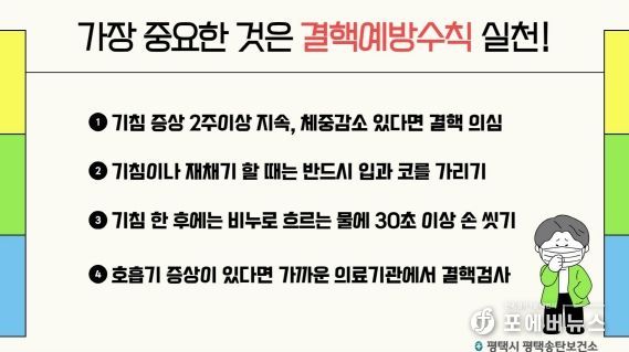 평택보건소 관계자는 “결핵은 예방과 조기 발견이 중요한 질병인 만큼 결핵 예방수칙 실천과 2주 이상 기침이 지속되면 검진을 받는 것이 매우 중요하다”고 당부하며, “유튜브 ‘평택·송탄보건소(몸마음 튼튼)’을 통해 결핵뿐만 아니라 건강에 대한 유익하고 다양한 정보를 확인할 수 있으니 많은 구독 바란다”고 전했다.
