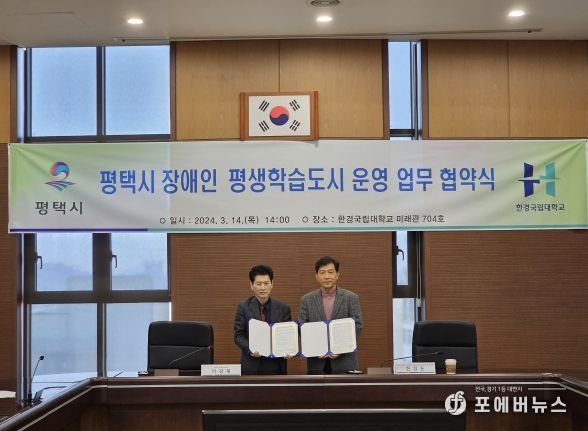 두 기관은 지난 14일 한경국립대학교 평택캠퍼스 미래관에서 협약식을 진행했으며, 이번 협약은 ‘장애인 평생학습도시 운영’ 공모사업 2년 연속 선정에 따라 추진됐다.