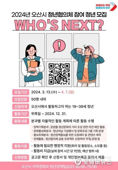 [ 포에버뉴스 최진성 기자 ] 오산시는 오는 4월 7일까지 ‘제4기 청년협의체’ 위원 50명을 공개 모집한다고 밝혔다.