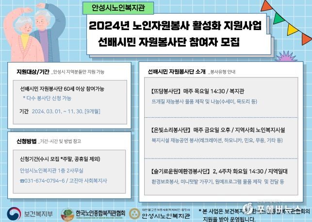[ 포에버뉴스 최진성 기자 ] 안성시노인복지관은 보건복지부, 한국노인종합복지관협회의 지원을 받아 2024년 노인자원봉사 활성화 지원사업'선배시민 자원봉사단'참여자를 모집한다고 11일 밝혔다.