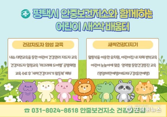 [ 포에버뉴스 최진성 기자 ] 평택시 안중보건지소는 미취학 어린이의 조기 건강 생활 습관 정착을 위해 평택 서부지역의 유치원과 어린이집 대상으로 새싹배움터 프로그램을 운영할 예정이다.