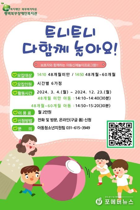 2024년 아동신체활동프로그램 ‘트니트니 다함께 놀아요!’는 12월까지 진행되며, 영유아기(60개월 미만) 아동 및 보호자를 대상으로 상시 모집 예정이며 추가 참여 및 기타 문의는 평택북부장애인복지관 아동청소년지원팀으로 하면 된다.