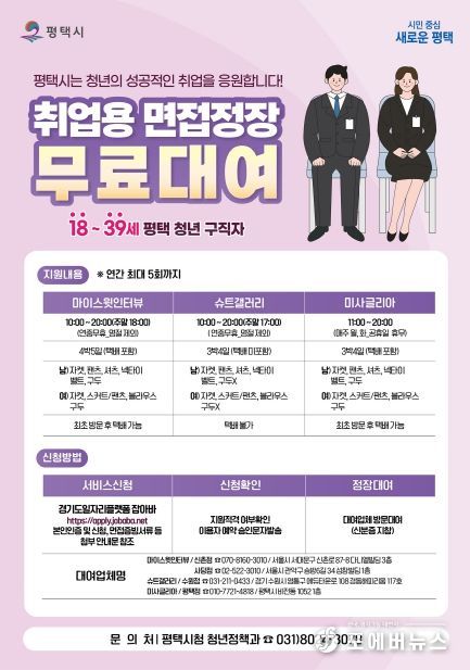[ 포에버뉴스 최진성 기자 ] 평택시는 ‘평택청년 면접정장 무료대여 서비스’를 3월 중순부터 확대 운영돼 관내 업체에서도 정장 대여가 가능해졌다고 밝혔다.