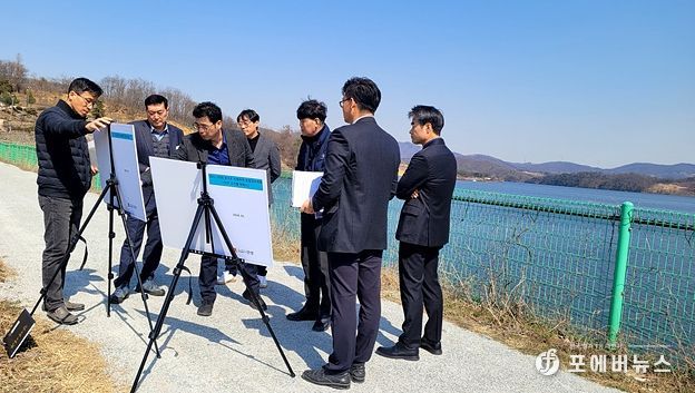 시와 관계자는 고삼호수 제방에서 브리핑을 시작으로 한천 전 구간의 현황과 한천 지방하천기본계획에 따른 주요 보축, 축제 구간을 위주로 현안을 공유하며 현장을 직접 살폈다.