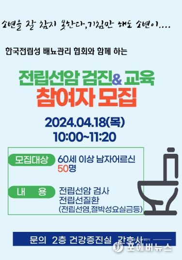 [ 포에버뉴스 최진성 기자 ] 안성시노인복지관은 한국전립선 배뇨관리협회(사단법인)와 함께 전립선 질환관리 교육 참여자 50명을 모집한다고 20일 밝혔다.
