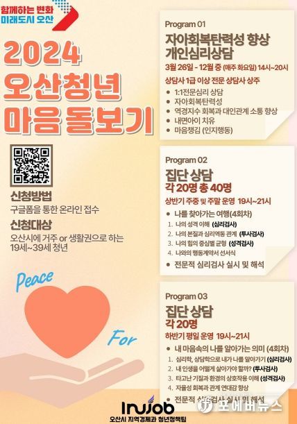 시 관계자는 “취업 준비, 고용불안, 학업 스트레스, 우울감 등 심리적 취약 상태에 있는 청년들이 정서적 안정과 심리 건강 회복을 할 수 있도록 이번 프로그램을 기획했으며, 상담을 통해 청년들이 마음을 튼튼히 지탱할 힘이 생기길 바란다.”고 말하며, “지역 내 청년들의 많은 관심과 참여를 부탁드린다”고 전했다.
