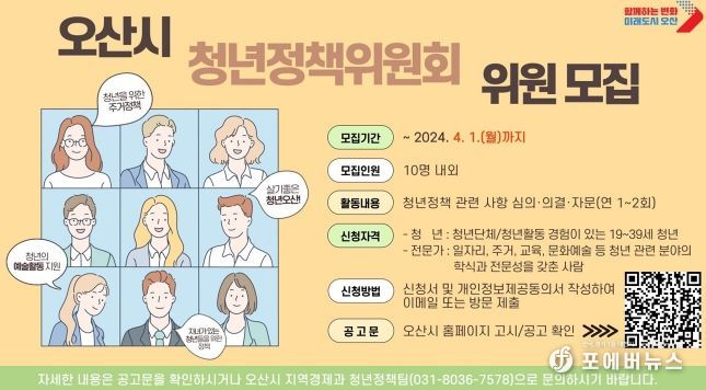 [ 포에버뉴스 최진성 기자 ] 오산시는 4월 1일까지 오산시 청년정책위원회 위촉직 위원 10여명을 공개 모집한다고 밝혔다.