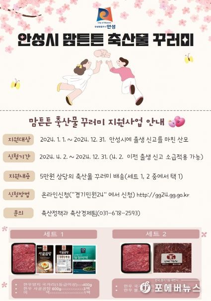 [ 포에버뉴스 최진성 기자 ] 안성시는 2024년 맘튼튼 축산물 꾸러미 지원사업을 시행한다고 밝혔다.이 사업은 산모의 건강 회복과 고물가에 위축된 축산업 경영난 극복을 위한 사업이다.