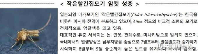 일본뇌염을 매개하는 '작은빨간집모기'는 논이나 동물축사, 웅덩이 등에 서식하는 암갈색의 소형모기로 주로 야간에 흡혈 활동을 하며, 3월 말부터 발생하기 시작해 8~9월에 정점을 보인다.
