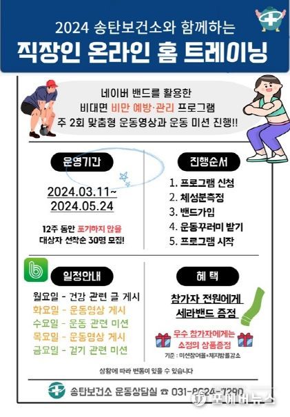 올해는 근로자들의 건강증진 프로그램을 추진하고 있는 관내 기업체를 선정·협업해 다양한 주제의 건강 정보를 제공하고, 건강 미션 및 걷기 DAY, 근력운동 영상 등을 통해 올바른 건강 생활 습관을 촉진하는 비대면 프로그램을 시행 중이다.