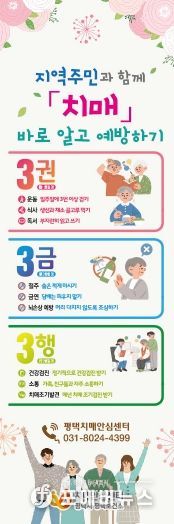 평택시 평택보건소 치매안심센터 관계자는 “시민들이 치매예방수칙 3·3·3을 생활 속에서 실천함으로써 치매 걱정 없는 건강한 노년을 누렸으면 좋겠다”고 말했다.
