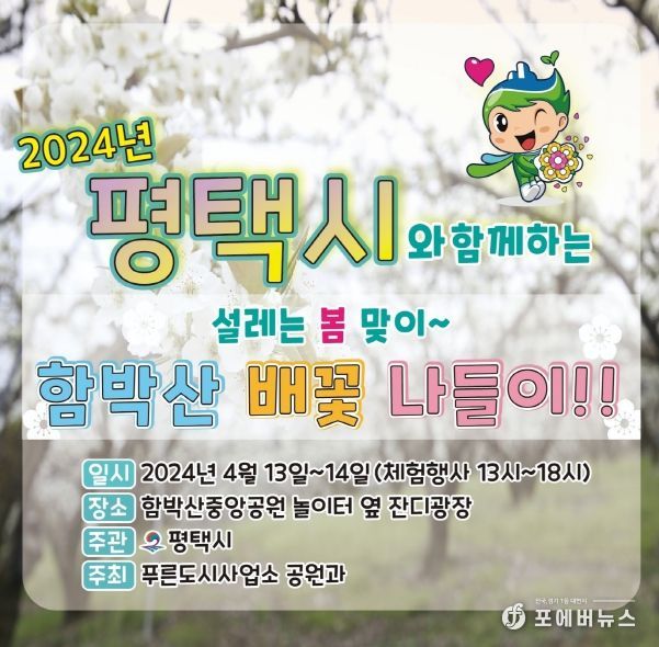 평택시는 “화창한 봄날, 가족들과 함께 함박산중앙공원에 방문해 하얀 배꽃과 함께 소중한 추억을 만들고, 봄기운을 마음껏 즐기면 좋겠다”라고 전했다.
