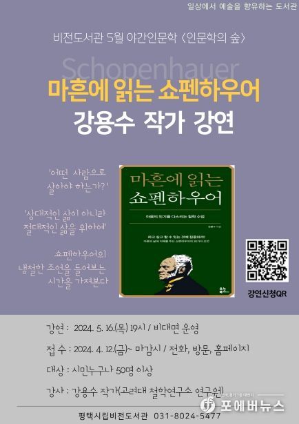 [ 포에버뉴스 최진성 기자 ] 평택시립 비전도서관이 오는 5월 16일 목요일 저녁 7시에 쇼펜하우어 신드롬을 일으키고 있는 화제의 책 '마흔에 읽는 쇼펜하우어'의 저자인 강용수 작가와 함께 마음의 위기를 다스리는 철학 강연을 비대면으로 진행한다.