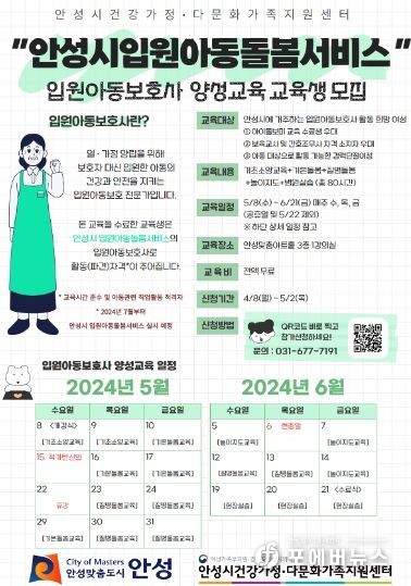 교육은 5월 8일부터 6월 21일까지 매주 수, 목, 금 안성맞춤아트홀 3층 1강의실에서 실시한다. 안성시에 거주하는 입원아동보호사 활동 희망 여성은 누구나 교육을 신청할 수 있으며, 교육신청 희망자는 오는 4월 8일부터 5월 2일까지 안성시건강가정·다문화가족지원센터로 신청하면 된다.