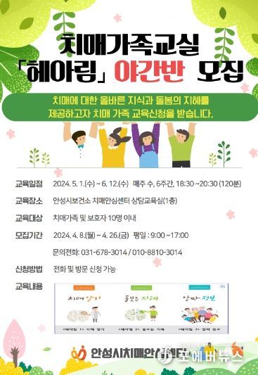 [ 포에버뉴스 최진성 기자 ] 안성시보건소 치매안심센터가 직장이나 생업으로 낮시간대 교육받기 어려운 치매가족을 위하여 치매가족교육 야간반을 개설하고 참여자를 모집한다고 8일 밝혔다.