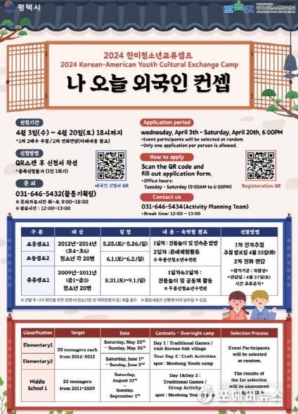 모집 기간은 오는 4월 20일까지이며, 신청을 원하는 청소년은 평택시청소년문화센터 누리집 공지사항 및 홍보물에 표시된 QR코드 스캔 후 신청서를 제출하면 된다.