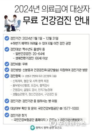 2024년 올해 의료급여수급권자 일반건강검진 대상자는 20~64세(1960~2004년도 출생자) 중 짝수년도 출생자로 검진 비용은 무료이며 검사 항목은 성별·나이별로 다르다.