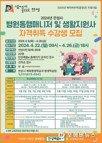 수강 신청 대상은 안성시민 50~65세이며, 접수기간은 4월 22일 9시 선착순접수로 진행되며, 수강신청은 교육통합 플랫폼 ‘안성배움e’홈페이지를 통해 인터넷 접수로 진행된다.