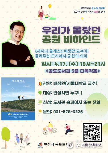 [ 포에버뉴스 최진성 기자 ] 안성시 공도도서관은 오는 4월 17일 오후 19시, '우리가 몰랐던 공원 비하인드' 인문학 프로그램을 공도도서관 3층 다목적홀에서 진행한다.