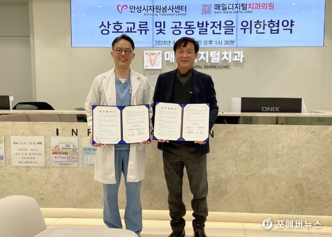 [ 포에버뉴스 최진성 기자 ] 지난 11일, 매일디지털치과의원에서 안성시자원봉사센터와 매일디지털치과의원이 상호교류 및 공동발전을 위한 업무협약을 체결했다.