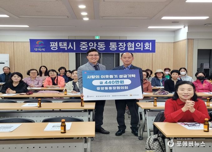 [ 포에버뉴스 최진성 기자 ] 평택시 중앙동 통장협의회는 지난 11일 평택행복나눔본부를 통해 이웃사랑 성금 440만 원을 중앙동 지역사회보장협의체에 기탁했다.