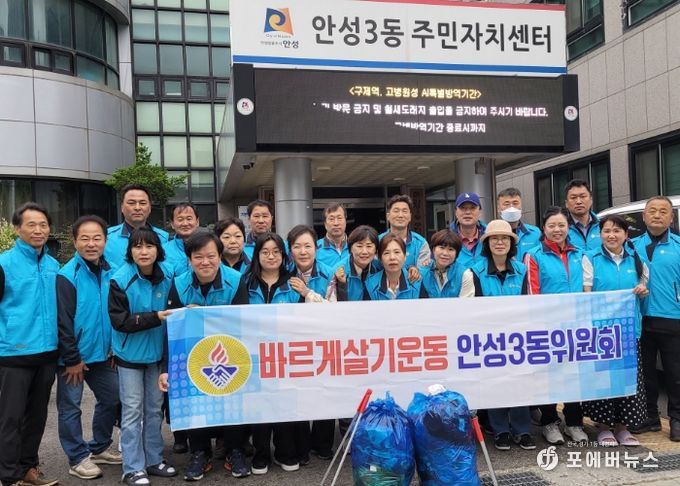 [ 포에버뉴스 최진성 기자 ] 안성시 안성3동 바르게살기위원회에서 아름다운 안성만들기를 위해 매월 셋쌔주 토요일 아침 7시에 환경정화활동을 추진한다고 밝혔다.