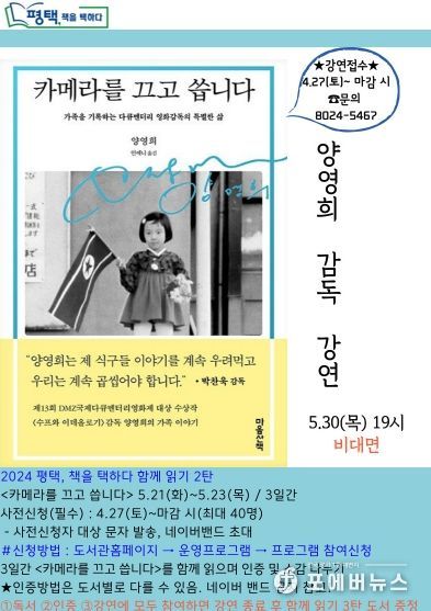 [ 포에버뉴스 최진성 기자 ] 배다리도서관은 2024년 평택시 함께 읽는 책 '카메라를 끄고 씁니다'의 저자 양영희 감독 강연을 5월 30일 저녁 7시에 비대면으로 진행한다고 밝혔다.