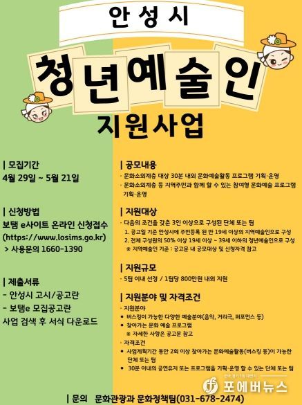 [ 포에버뉴스 최진성 기자 ] 안성시는 청춘이 행복한 문화도시를 위해 진행하는“안성시 청년예술인 지원사업”에 참여할 지역예술인들을 4월 29일부터 5월 21일까지 모집한다고 밝혔다.