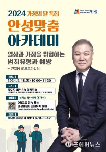 이번 가정의 달 특집 강연은 연일 발생하는 우리 주변의 범죄에 대해 안성시민의 대응 능력 향상과 경각심 제고를 위해 프로파일러의 시선에서 몰입감 있게 범죄 예방에 대해 약 90분간 조명할 예정이며,