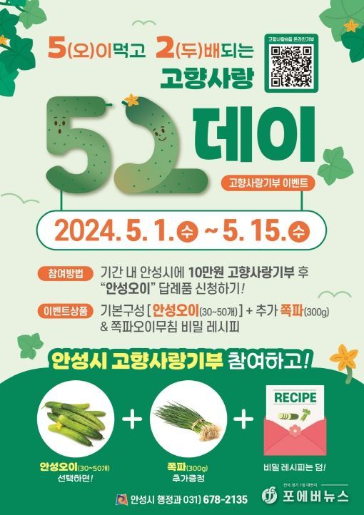 [ 포에버뉴스 최진성 기자 ] 안성시가 오이데이(5.2.)를 맞이하여 오(5)이먹고 두배(2)되는 고향사랑 이벤트를 5월 1일부터 2주간 추진한다고 밝혔다.
