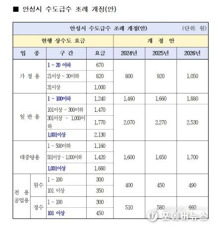 [ 포에버뉴스 최진성 기자 ] 안성시는 지난 2003년부터 21년 동안 동결된 수도 요금을 올해 하반기부터 3년간 매년 15%씩 인상하기로 하고 관련 절차를 진행 중이라고 밝혔다.