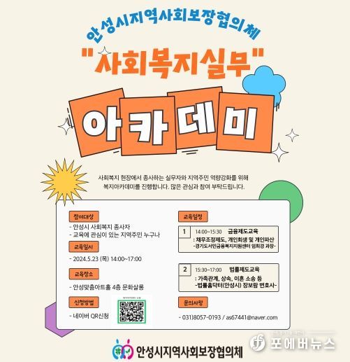 [ 포에버뉴스 최진성 기자 ] 안성시지역사회보장협의체 통합서비스지원분과에서 사회복지 현장 종사자 및 지역주민의 역량 강화를 위해 2024. 5. 23. 14:00∼17:00 안성맞춤아트홀 4층 문화살롱에서 '사회복지 실무 아카데미'를 개최할 예정이다.