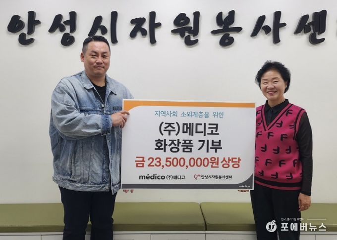 [ 포에버뉴스 최진성 기자 ] 지난 4월 30일, ㈜메디코에서 5월 가정의 달을 맞아 취약계층과 다문화 가정의 생활관리 향상을 위한 화장품 510박스(2,350만원 상당)를 안성시자원봉사센터에 기탁해 전달식을 진행했다.