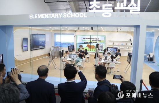 특히 개막 전부터 교육계 안팎에서 큰 화제를 모았던 글로컬 미래교실에 대한 언론의 관심이 뜨거웠다. 여수세계박람회장 국제관 A동에 구축된 글로컬 미래교실은 유치원 1실, 초등1실, 중등1실, 프로젝트1실, 스마트오피스 1실 총 6개 실이 마련됐다. 이날 초등 1실에서는 학생 14명이 참여한 가운데 실제 수업이 진행돼, 취재진들의 이목을 끌었다.