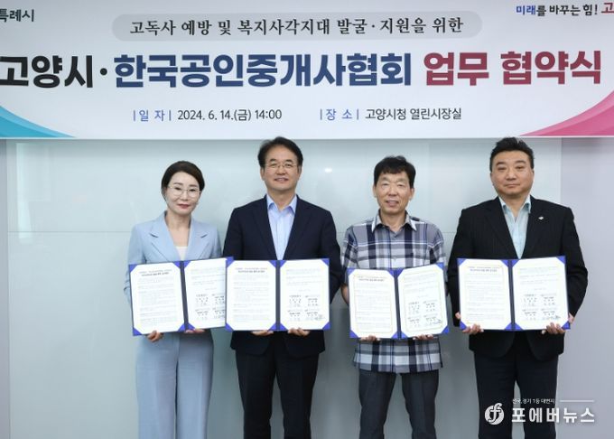[ 포에버뉴스 김경순 기자 ] 고양특례시는 14일 시청 열린시장실에서 한국공인중개사협회 3개구(덕양구, 일산동구, 일산서구) 고양지회와 복지사각지대 발굴 체계 구축을 위한 업무협약을 체결했다고 밝혔다.