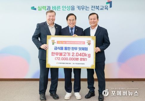 [ 포에버뉴스 이승훈 기자 ] 전북특별자치도교육청과 (사)전국한우협회 전북도지회는 11일 도교육청 5층 접견실에서 학생들에게 한우고기를 지원하는 ‘학교급식 한우 맛체험’ 기증식을 했다.