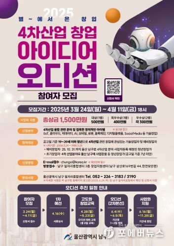 남구 관계자는 “참여자들이 가지고 있는 4차산업 창업아이디어들은 세상을 변화시킬 수 있는 잠재력을 충분히 가지고 있는 창업아이템으로 수상의 영예와 성공적인 기술 창업의 꿈을 함께 이룰 수 있도록 오디션 대비 고도화 창업 교육에 성실히 참여해 자신의 역량을 강화해 보길 바란다”고 전했다.