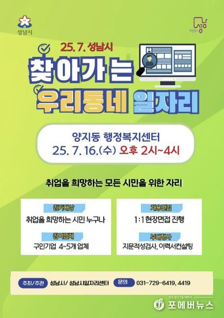 [ 포에버뉴스 김경순 기자 ] 성남시는 오는 7월 16일 오후 2시부터 4시까지 양지동 행정복지센터 4층 다목적실에서 ‘찾아가는 우리동네 일자리’ 채용행사를 개최한다.
