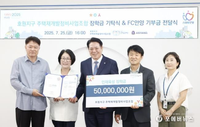 [ 포에버뉴스 김경순 기자 ] 안양시 인재육성재단은 호원지구 주택재개발정비사업조합으로부터 5천만 원의 인재육성 장학금을 기탁받아 지난 25일 기탁식을 개최했다고 29일 밝혔다.