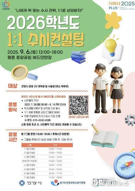 [ 포에버뉴스 김경순 기자 ] 안양시가 주최하고 안양시 인재육성재단이 주관하는 ‘2026학년도 1:1 수시컨설팅’이 오는 9월 6일 12시 평촌중앙공원에서 개최된다.