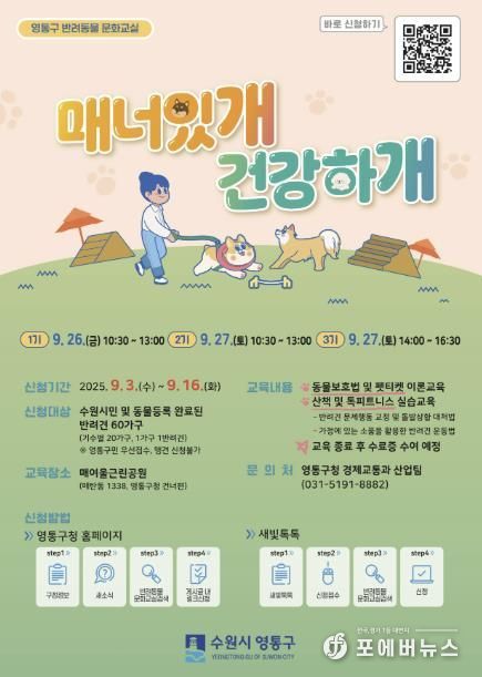 반려동물 문화교실 교육 참가자는 동물등록이 완료된 반려견과 그 보호자인 수원시민 60가구를 대상으로 9월 3일부터 16일까지 새빛톡톡에서 선착순 모집할 예정이며, 자세한 내용은 영통구청 홈페이지 및 새빛톡톡에서 확인할 수 있다.
